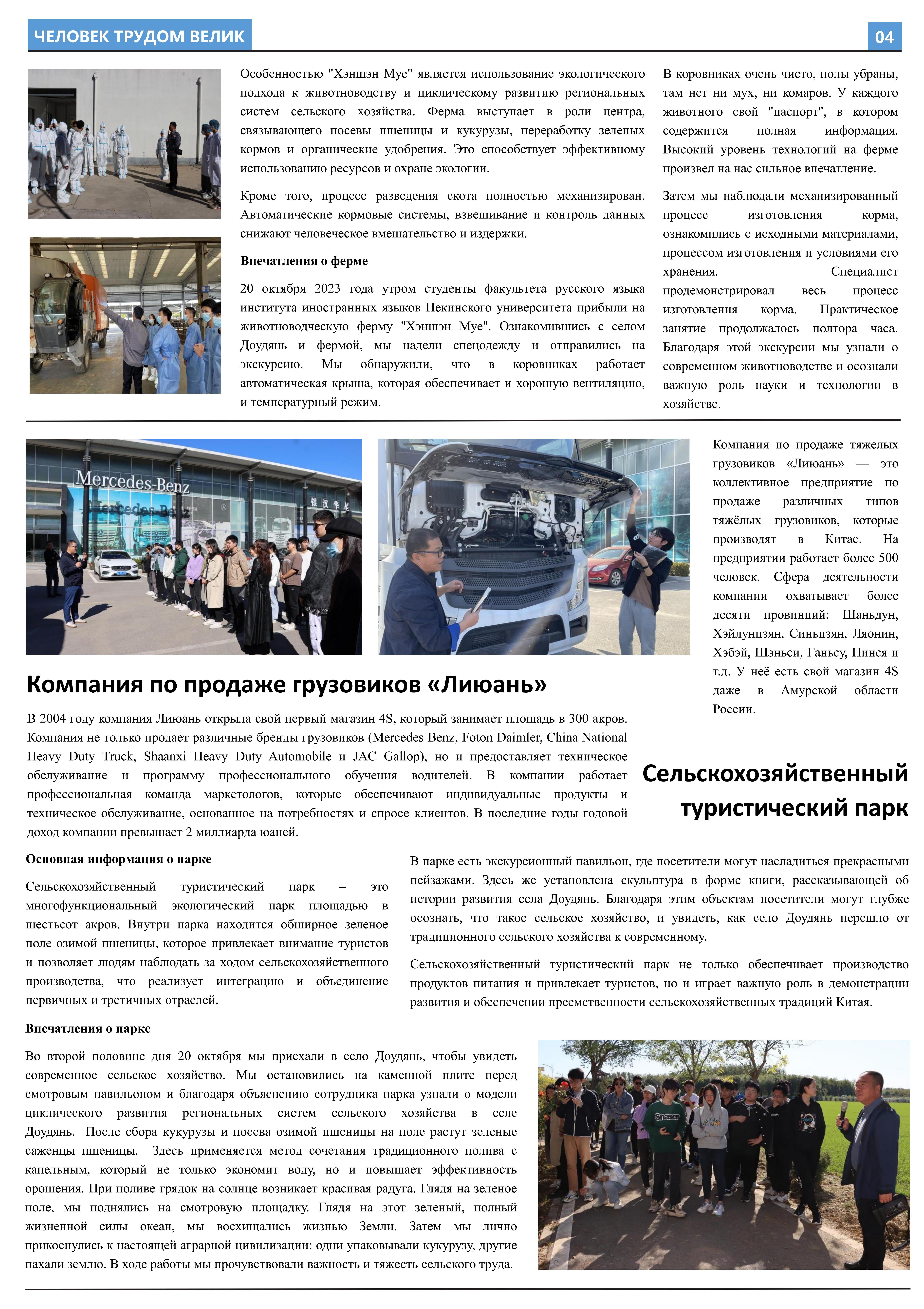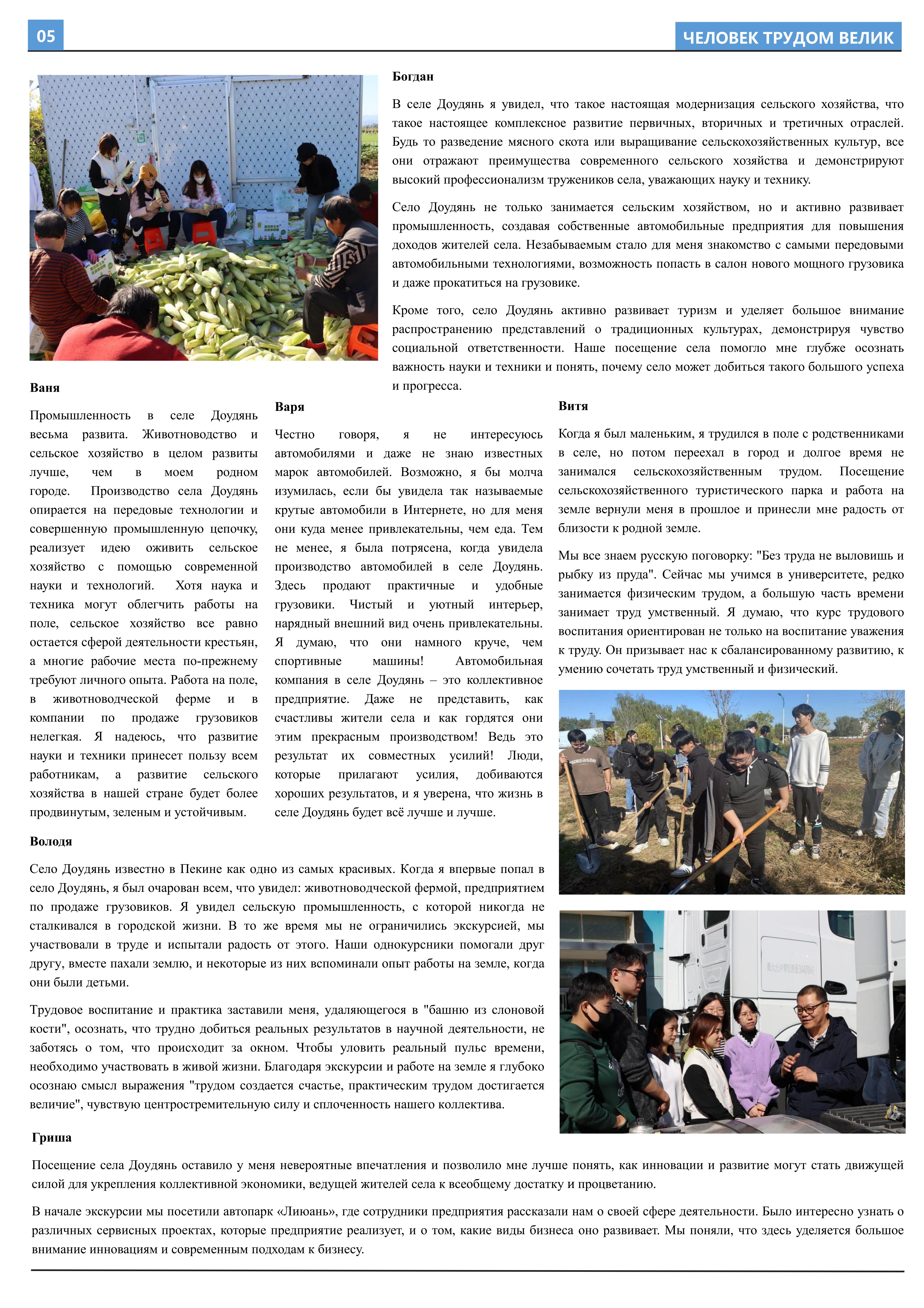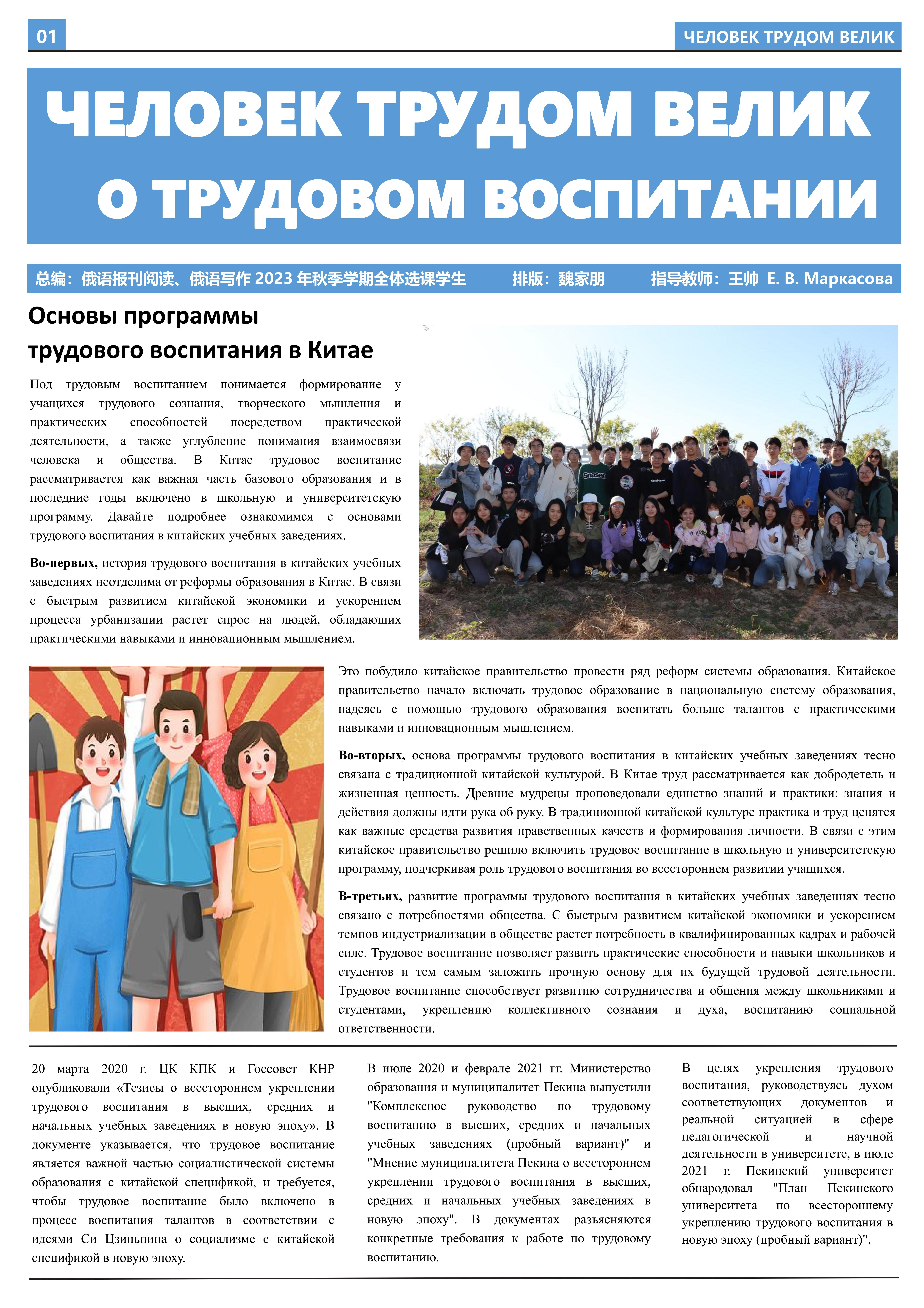 在接受劳动教育、参与劳动实践后,2023年10月至2023年12月,华体会平台2021级俄语本科生班的11名同学立足于学院平台和专业课堂(《俄语报刊阅读(上)》与《俄语写作(上)》),在两位课程主讲教师王帅和外教叶莲娜·马尔卡索娃(Елена Маркасова)的指导下,通过线上分工、小组讨论等形式商讨报纸细节,并学习使用重要概念和关键词句的俄语表达,历时近三个月,共同完成6个版面、3000余个单词数的“劳动成就人——关于劳动教育”主题报纸。报纸共分为8个大主题、13个小主题,全面介绍了华体会平台劳动教育课程的实施背景及学生参与情况,系统阐述了窦店村的历史文化与经济发展等多方面内容,并详细记录了同学们在窦店村恒升牧业畜牧养殖中心、窦店利元车业、农业观光园等劳动教学点的劳动实践与参访感受。