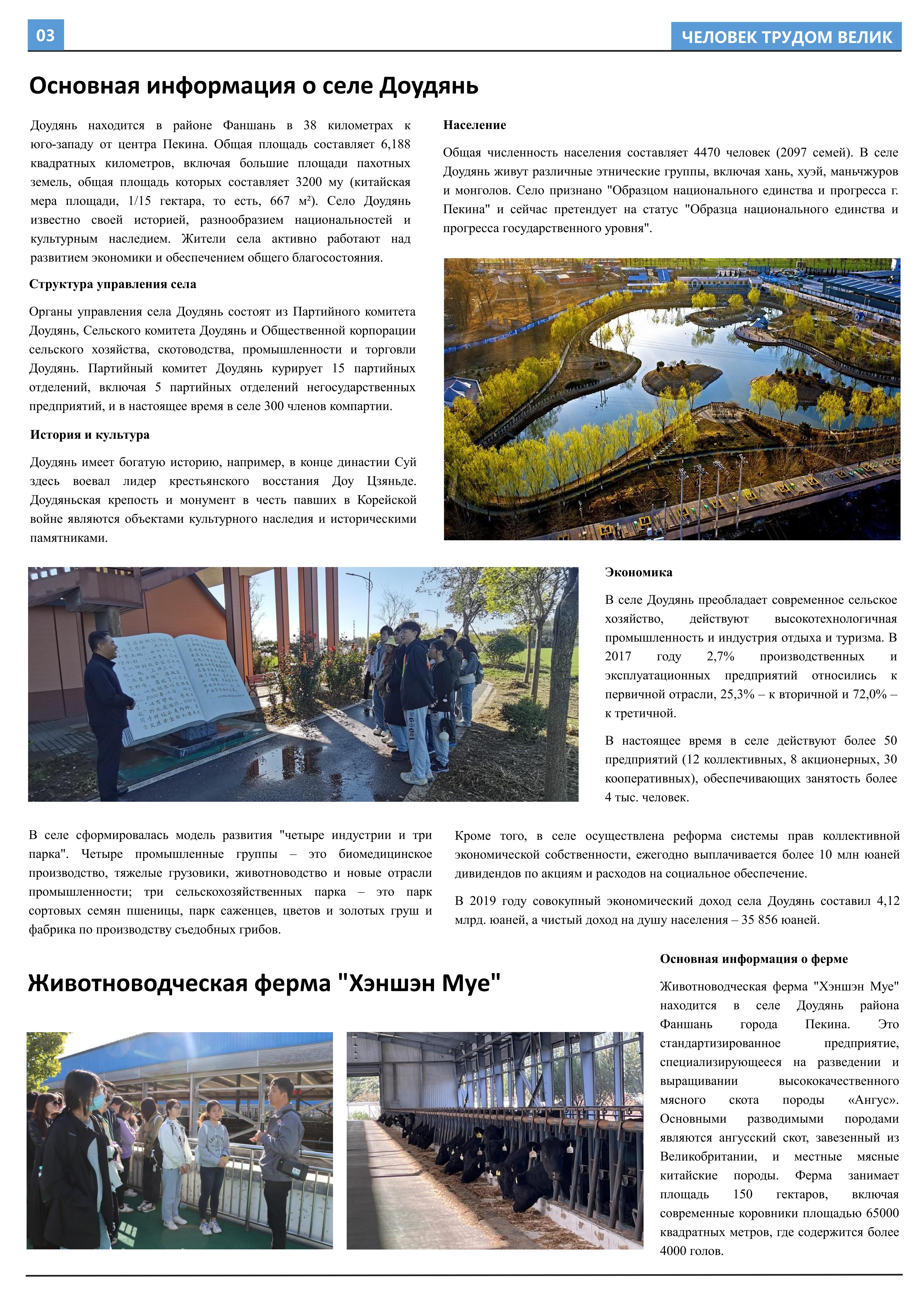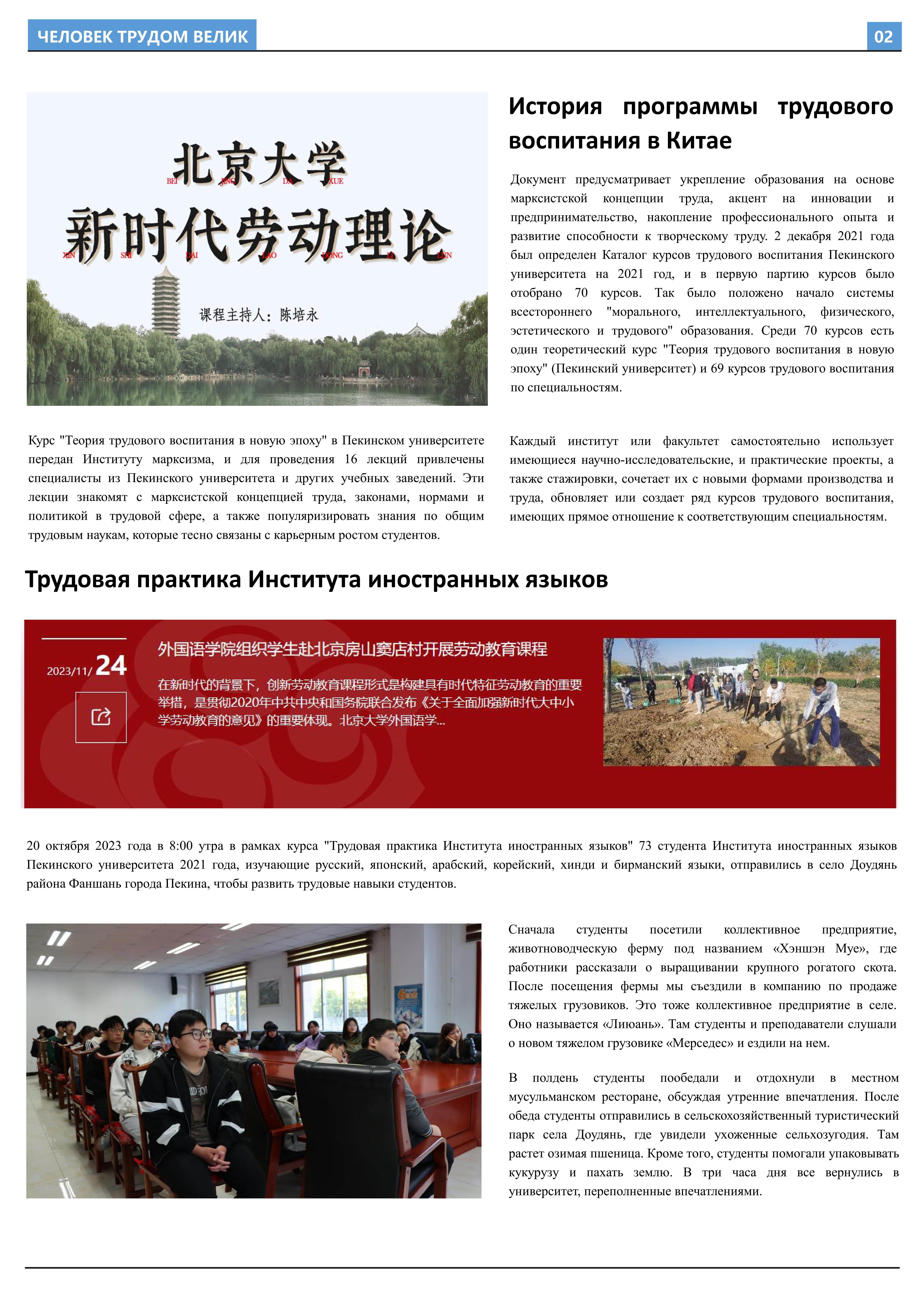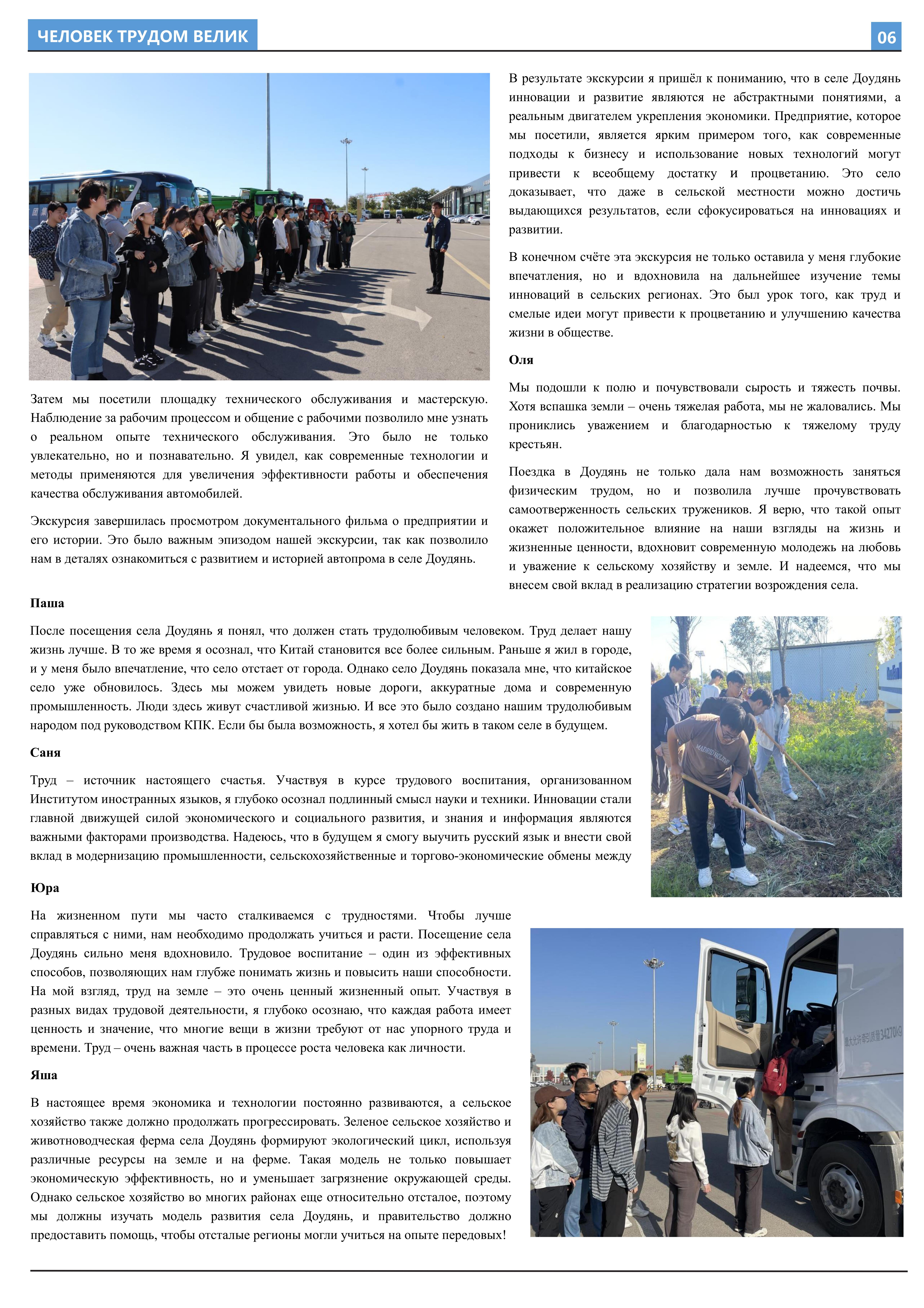 在接受劳动教育、参与劳动实践后,2023年10月至2023年12月,华体会平台2021级俄语本科生班的11名同学立足于学院平台和专业课堂(《俄语报刊阅读(上)》与《俄语写作(上)》),在两位课程主讲教师王帅和外教叶莲娜·马尔卡索娃(Елена Маркасова)的指导下,通过线上分工、小组讨论等形式商讨报纸细节,并学习使用重要概念和关键词句的俄语表达,历时近三个月,共同完成6个版面、3000余个单词数的“劳动成就人——关于劳动教育”主题报纸。报纸共分为8个大主题、13个小主题,全面介绍了华体会平台劳动教育课程的实施背景及学生参与情况,系统阐述了窦店村的历史文化与经济发展等多方面内容,并详细记录了同学们在窦店村恒升牧业畜牧养殖中心、窦店利元车业、农业观光园等劳动教学点的劳动实践与参访感受。