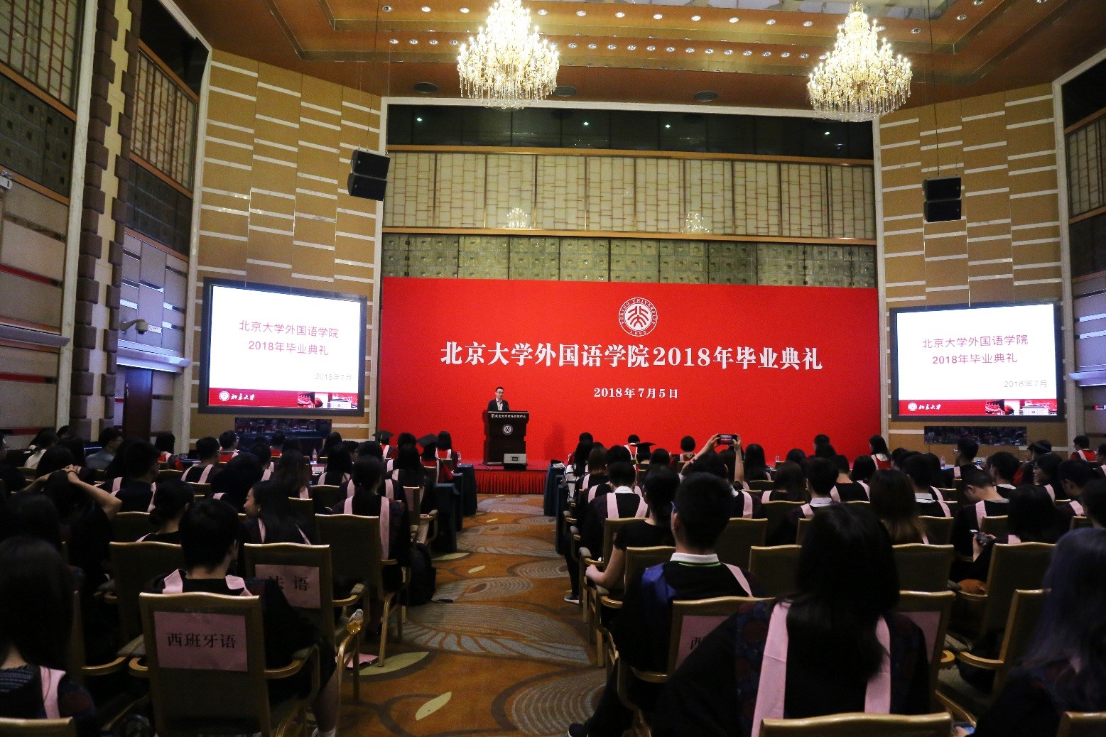 2018年7月5日上午,华体会平台2018年毕业典礼在英杰交流中心阳光厅举行。华体会平台院长宁琦、党委书记李淑静、副院长付志明、吴杰伟出席毕业典礼。参加典礼的还有阿拉伯语系系主任林丰民、教师代表廉超群,朝韩语系系主任王丹、副系主任南燕,德语系系主任黄燎宇,东南亚系系主任咸蔓雪、教师代表万悦容、郄丽莎、史阳、黄轶,俄语系系主任陈松岩、教师代表刘洪波、褚敏,法语系系主任董强、教师代表罗湉,南亚系系主任陈明、教师代表张亚冰、萨尔吉,日语系副系主任李奇楠、教师代表孙建军,西葡语系系主任范晔,西亚系系主任时光、教师代表王一丹、魏丽明,外国语言学及应用语言学研究所副所长高彦梅、教师代表胡旭辉,世界文学研究所教师代表胡旭东,英语MTI教育中心教师代表栗洁歆,团委书记王艳超、副书记邹雨浓、冯一帆及华体会平台2018届本科生、研究生同学。典礼由院党委副书记王恒主持。