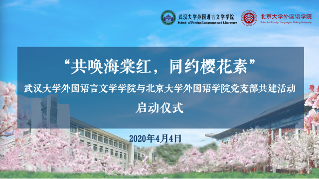 在此次两院共建活动中,由两个研究生党支部和两个本科生党支部分别对接,在研究生党支部层面,由武大外院2019级MTI研究生党支部和北大外院朝韩语系研究生党支部共建,从思想共建、文化共建、生涯共建、志愿共建等四个方面入手,引领双方党员提高党性修养,建立深厚友谊,在学好专业本领的同时强化青年党员的责任与担当。在本科生党支部层面,由武大外院本科生小语种党支部和北大外院本科生第三党支部共建,从日常学习、个人发展、心理沟通三个层面全方位搭建两支部互助平台,在共建活动中继续深入学习习近平总书记重要回信精神,发挥党员模范带头作用。目前,两院党支部共建活动已正式启动,未名湖畔,洛珈山下,外语人将携手并进,共同将青春的诗篇书写在祖国的山河中,共同守望战疫胜利的到来。