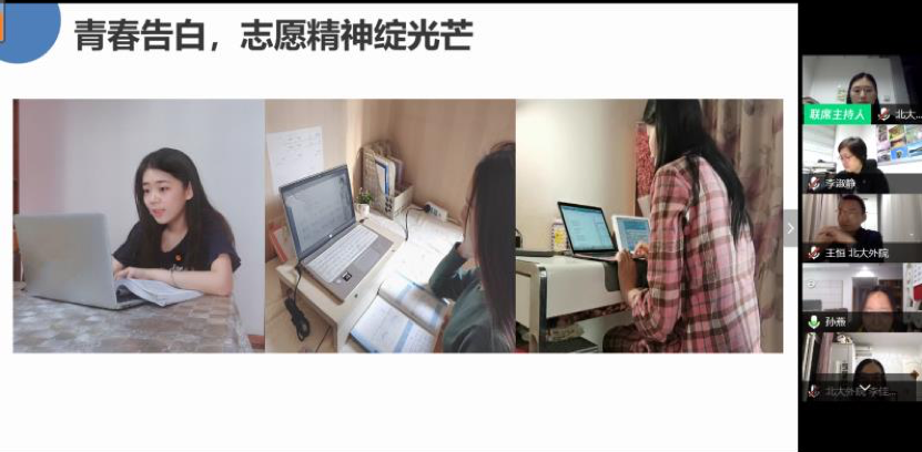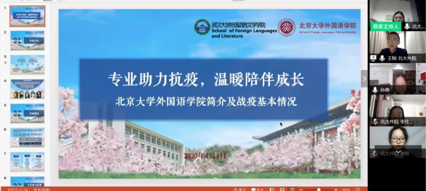 王恒介绍了北大外院的战疫工作。本次新冠肺炎疫情爆发以来,学院第一时间成立了防控工作小组,指导师生全体开展网络授课。在北大援鄂医疗队收到总书记回信后,学院组织党团骨干、兼职辅导员等多次集体学习,并邀请援鄂医疗队“90后”党员代表、选调生代表、党员志愿者代表共同交流学习感悟。在战疫工作中,外院师生凭借专业知识,积极投身到医疗物资和治疗方案的翻译工作中,组建了300余人的翻译志愿小组,坚守后方,用专业知识为防疫贡献力量;与湖北恩施来凤县中小学取得联系,联合举办线上学习陪伴志愿活动;为了丰富学生生活,学院组织了线上技能培训,为毕业班同学提供就业面试指导,并举行了多样线上文体活动,用专业助力抗疫,用温暖陪伴成长。