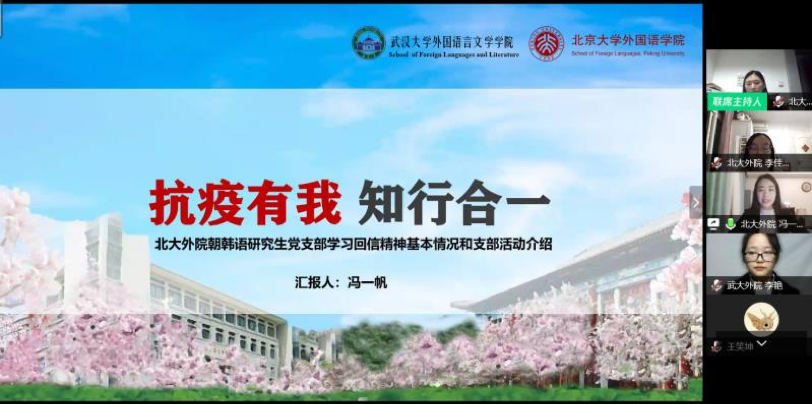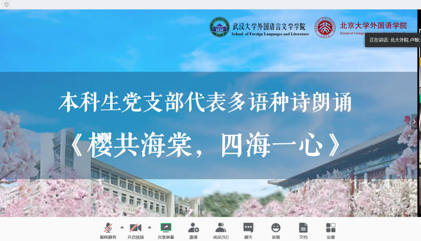 北大外院本科生第三党支部、武大外院本科生小语种党支部代表联合表演多语种诗朗诵《樱共海棠,四海一心》,各党员同学分别选取所学语种中表达“人类命运共同体”理念的诗句,共同表达外院人为全球抗疫做贡献的信心和决心。