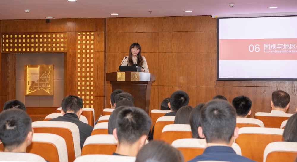 会议还开展了中央八项规定精神专题学习,与会师生共同观看了教育短片,深化对作风建设重要性的认识。最后,阿语研究生党支部党员邓纬琳结合专业特长,作了国别区域研究专题报告。