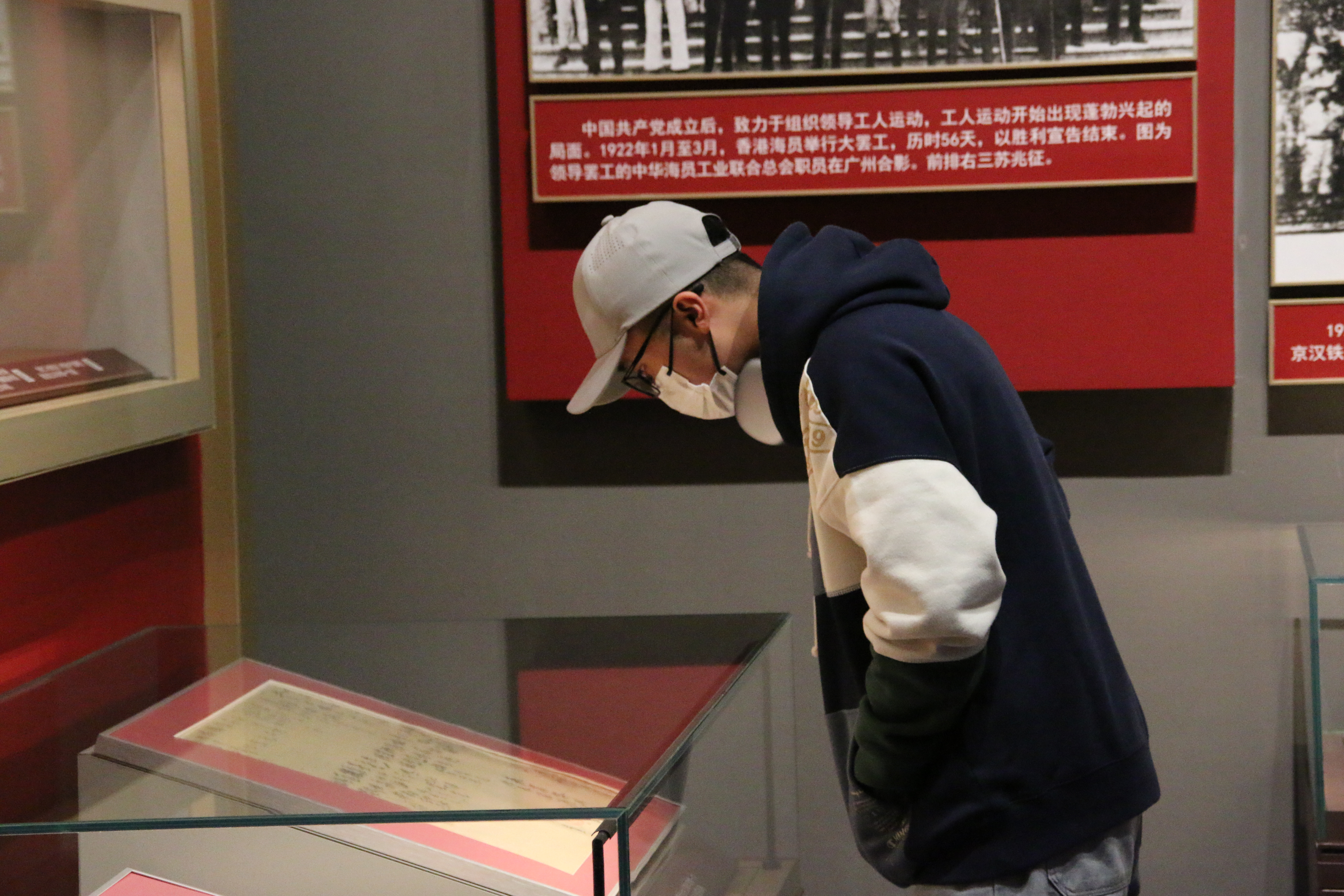 在讲解员的引导下,同学们在历史展览馆中穿梭百年光阴,回顾了从1921年到2021年这百年来,我党艰苦卓绝的奋斗历程和光辉灿烂的成就。从复原的中共一大会址、南昌起义时贺龙使用的手枪和工农革命军第一军第一师军旗,到开国大典上毛泽东同志使用的话筒、穿戴的衣帽和庆典活动的珍贵视频;从邓小平同志在中央工作会议上所作《解放思想,实事求是,团结一致向前看》的讲话提纲手稿,到党的十八大以来习近平总书记作出的重要批示……一件件珍贵的文物、一份份详实的档案、一张张生动的图片、一帧帧朴实的视频、一处处逼真的场景,都在诉说着一个个感人至深的故事。