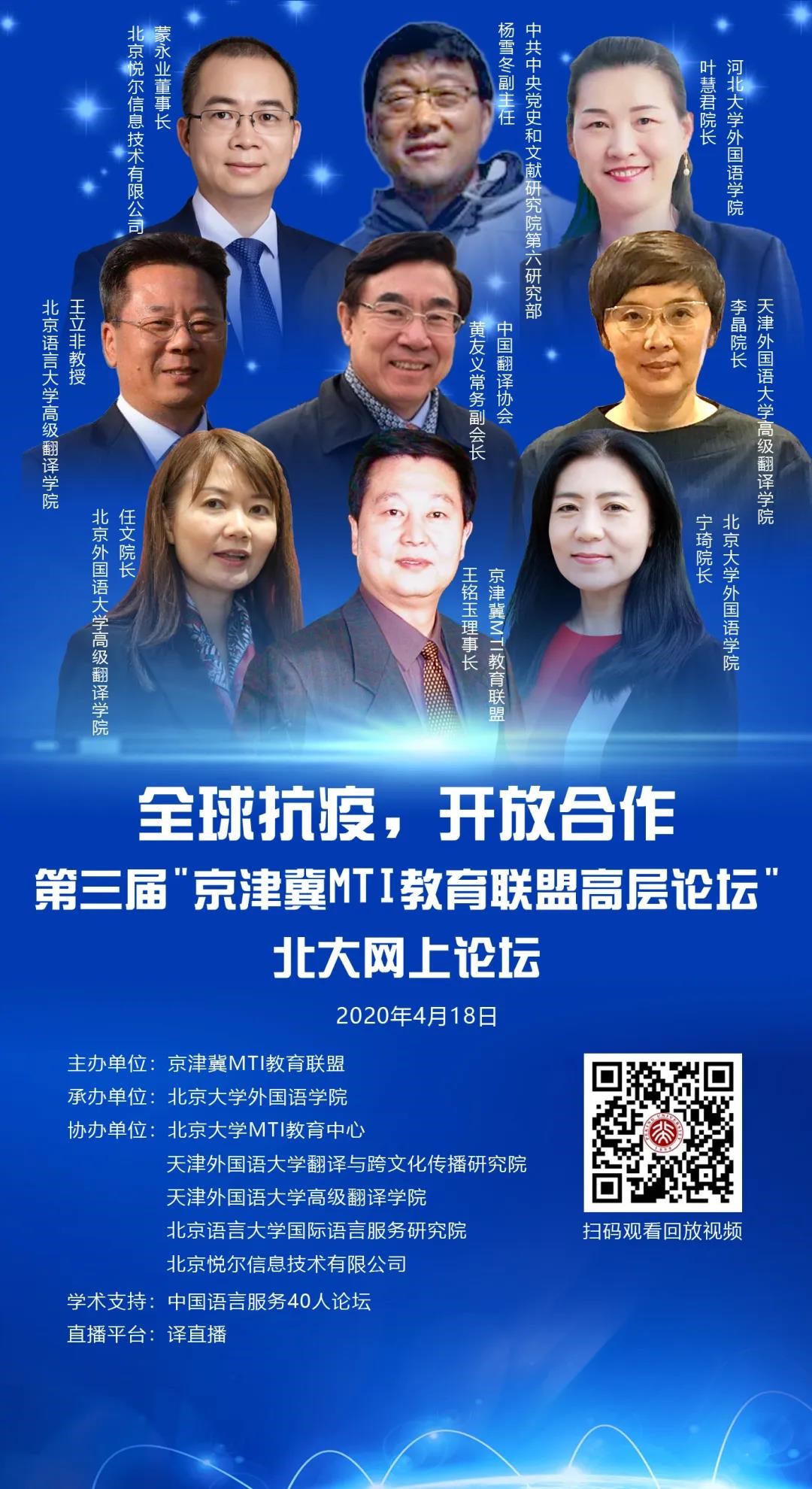 4月18日,以“全面凝聚抗疫合力,加强京津冀语言服务合作”为主题的第三届“京津冀MTI教育联盟高层论坛”北京大学网上论坛成功举行。本次论坛由京津冀MTI教育联盟主办,华体会平台承办,北京大学MTI教育中心、天津外国语大学翻译与跨文化传播研究院、天津外国语大学高级翻译学院、北京语言大学国际语言服务研究院、北京悦尔信息技术有限公司共同协办。中国语言服务40人论坛提供学术支持,新华网、人民网、光明网、新浪网、凤凰网、中国网等提供媒体支持,论坛译直播平台同步直播。共有来自145个机构的202名人员报名参会,其中来自境内高校178人,境外高校5人,翻译行业15人,其他机构4人。译直播平台有14442人收看同步直播。