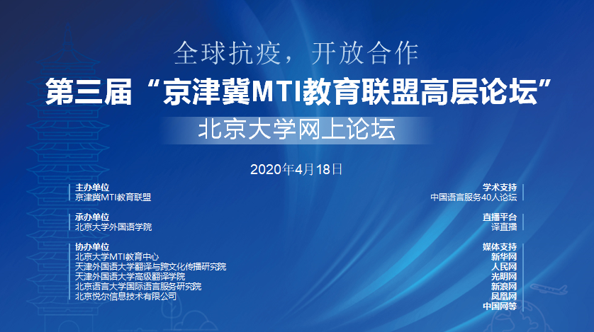 4月18日,在外院新楼举办以“全面凝聚抗疫合力,加强京津冀语言服务合作”为主题的“第三届京津冀MTI教育联盟高层论坛”北京大学网上论坛。论坛由京津冀MTI教育联盟主办,华体会平台承办,中国语言服务40人论坛提供学术支持,新华网、人民网、光明网、新浪网、凤凰网、中国网等提供媒体支持,论坛译直播平台同步直播,14442人收看同步直播。外院技术服务团队全程提供技术支持和协助,全力保障论坛的顺利进行。