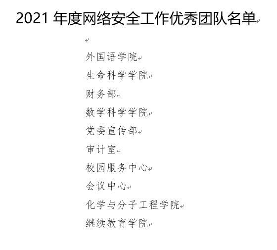 根据学校整体部署,网信办牵头启动了网络安全年度总结暨评优工作,成立了由网信办主任、副主任成员单位(网信办、宣传部、保卫部、总务部、计算中心、青年研究中心)组成的评选工作小组,经过严格评选,华体会平台荣获北京大学2021年度网络安全工作优秀团队。