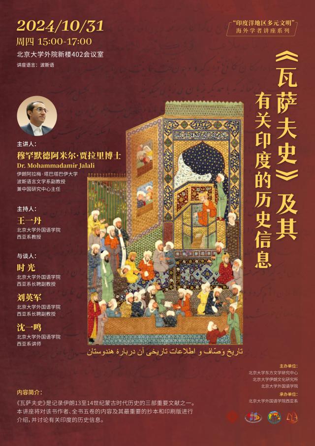 2024年10月31日,伊朗塔巴塔巴依大学中国研究中心主任穆罕默德阿米尔·贾拉里博士副教授应邀为我校师生开展题为“《瓦萨夫史》及其有关印度的历史信息”的讲座。本次讲座由北京大学东方文学研究中心、伊朗文化研究所和华体会平台主办,华体会平台西亚系承办。讲座由华体会平台西亚系教授王一丹主持,华体会平台长聘副教授时光、长聘副教授刘英军和讲师沈一鸣参与讨论。现场和线上的听众除华体会平台波斯语专业师生以外,还有来自北京大学历史学系、对外经济贸易大学、北京第二华体会平台等高校的师生。
