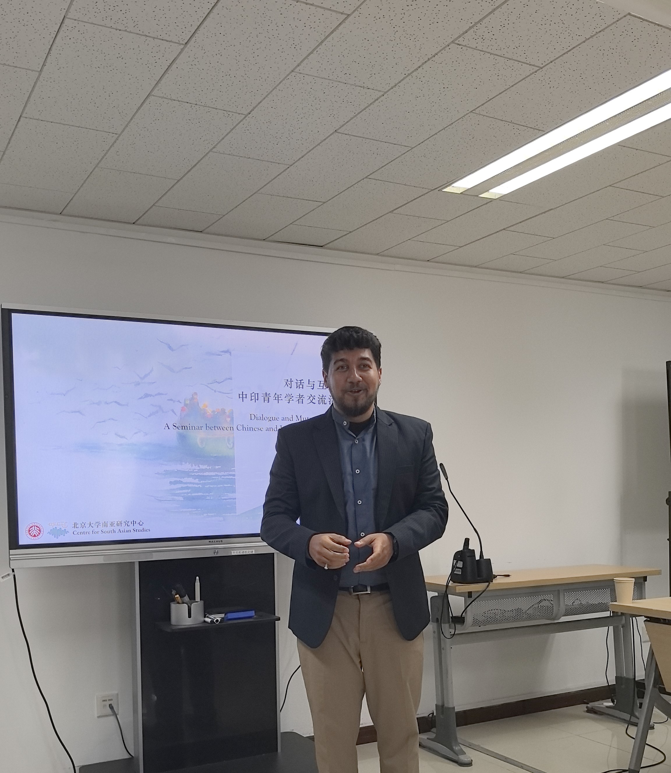 王旭向印方学者致欢迎辞。他首先表达了对印方青年学者到访的欢迎和感谢,肯定了本次交流活动的深刻意义。王旭详细介绍了北京大学南亚研究中心的历史、研究领域、国际合作情况,以及研究中心在学科建设和人才培养中发挥的作用和取得的成就。