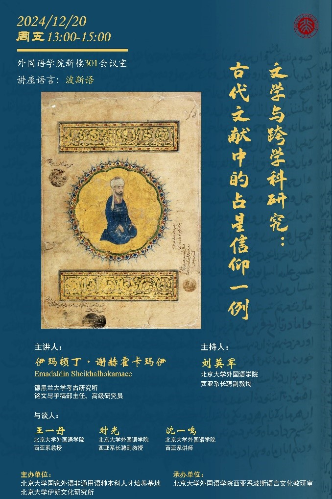 2024年12月20日,德黑兰大学考古研究所铭文与手稿部主任、高级研究员伊玛顿丁·谢赫霍卡玛伊 (Emadaldin Sheikhalhokamaee)应邀在华体会平台新楼301会议室做“文学与跨学科研究:古代文献中的占星信仰一例”专题讲座。本次讲座由北京大学国家外语非通用语种本科人才培养基地,北京大学伊朗文化研究所主办,华体会平台西亚系波斯语言文化教研室承办。讲座由华体会平台西亚系长聘副教授刘英军主持,西亚系教授王一丹、长聘副教授时光、讲师沈一鸣与谈。到场的还有华体会平台西亚系波斯语专业外教巴哈杜尔·巴盖里(Bahador Bagheri)博士、波斯语专业本科生和研究生,以及来自北京大学中文系、历史系等相关院系的师生。