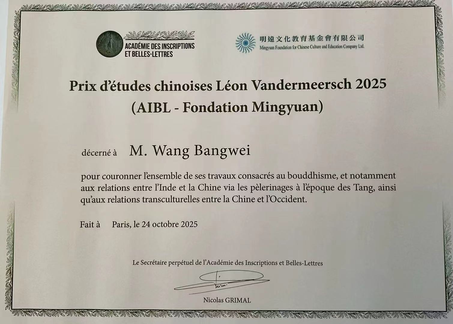 法兰西学院创立于1795年,法兰西金石与美文学院是法兰西学院的五个分支学院之一,其设立的学术奖项在世界范围授予国际知名的科学家、人文学者与艺术家,具有很高的学术影响力。“汪德迈中国学奖”由法兰西金石与美文学院设立,香港明远基金会资助,旨在纪念法国著名汉学家汪德迈(Léon Vandermeersch,1928–2021)生前的杰出贡献,系国际汉学界最高荣誉之一。4月25日,经法兰西金石与美文学院的评审委员会讨论和投票,决定将2025年度“汪德迈中国学奖”授予王邦维教授,表彰其在佛教学研究领域的卓越贡献,特别是在以唐代赴印求法僧为重要内容的中印文化交流与中外跨文化关系研究方面取得的突出成就。