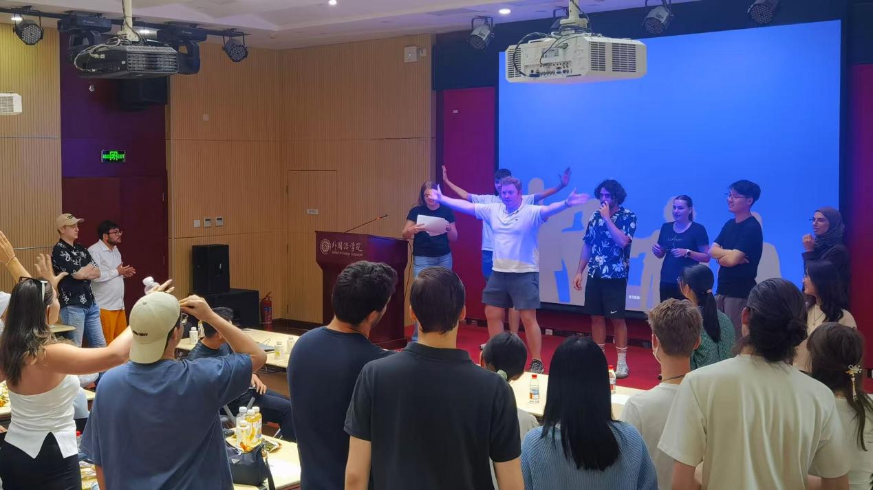 精彩的书法讲座之后,同学们通过精心设计的小游戏带领德国同学继续走进丰富多彩的中国文化。德语系2023级硕士生刘子婧主持“数字抱团”游戏,迅速活跃气氛,两国学生很快在互动中建立起友谊。《公共基础德语》课程优秀学生代表、法学院2023级本科生孙斯皇和德语系2024级本科生马希予合作主持了“你划我猜”游戏环节。两国学生分组通过肢体语言表现中德文化的许多代表性词汇(例如,“长城”“月饼”“浮士德”等),同学们充分发挥想象力,奉献了诸多巧妙构思,现场氛围越发热烈。